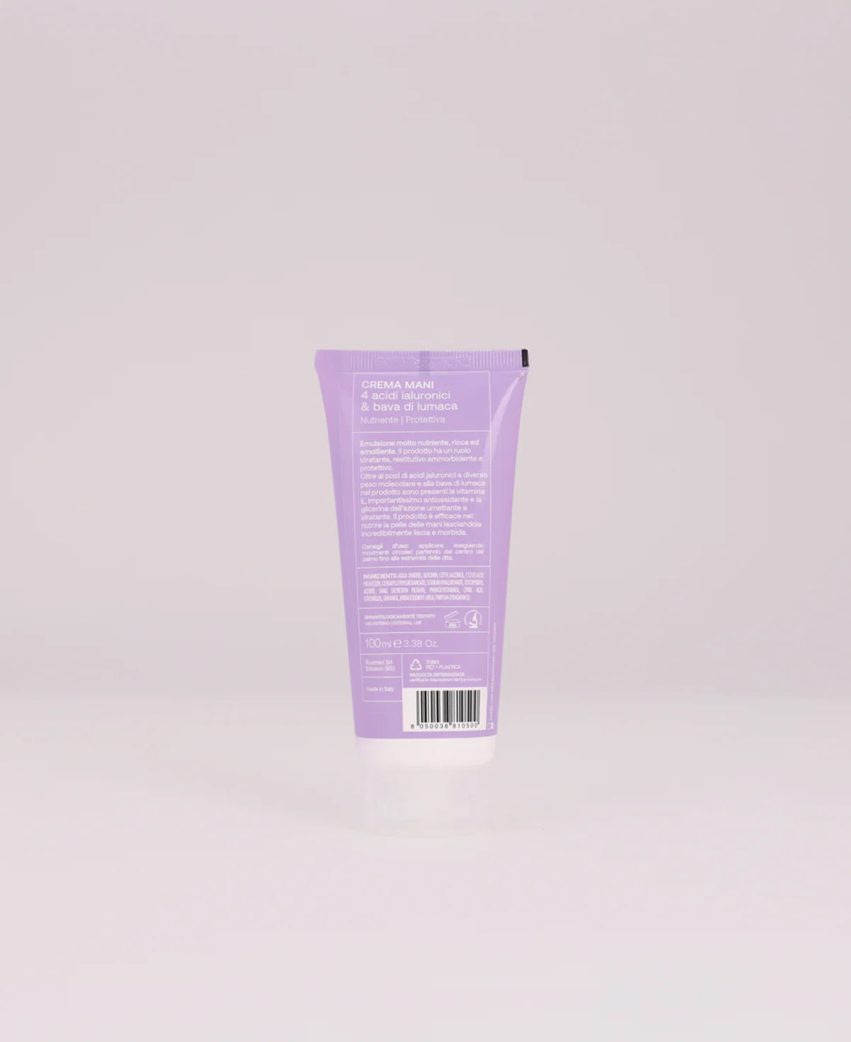Emulsione molto nutriente, ricca ed emolliente. La crema mani ha un ruolo idratante, restitutivo ammorbidente e protettivo. Oltre al pool di acidi jaluronici a diverso peso molecolare e alla bava di lumaca nel prodotto sono presenti la vitamina E, importantissimo antiossidante, e la glicerina dall’azione umettante e idratante. La formula è veramente efficace nel nutrire la pelle delle mani lasciandola incredibilmente liscia e morbida. Nutre le mani e le protegge prevenendo le screpolature dovute al freddo.
