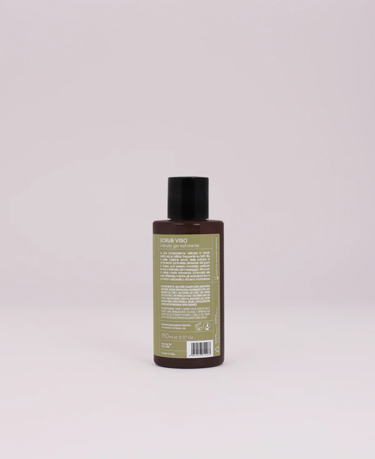 Delicato scrub viso formulato in gel. La sua composizione delicata lo rende adatto ad un utilizzo frequente su tutti i tipi di pelle. L’azione scrub, ottenuta grazie alla presenza di polvere di dimensione controllata derivante dai gusci di Argan, può essere modulata variando tempo e intensità del massaggio. L’utilizzo del prodotto permette di rimuovere le cellule morte ridonando luminosità alla pelle affaticata dallo stress e dallo smog. Inoltre gli acidi jaluronico e pirrolidon carbossilico donano morbidezza e idratazione.