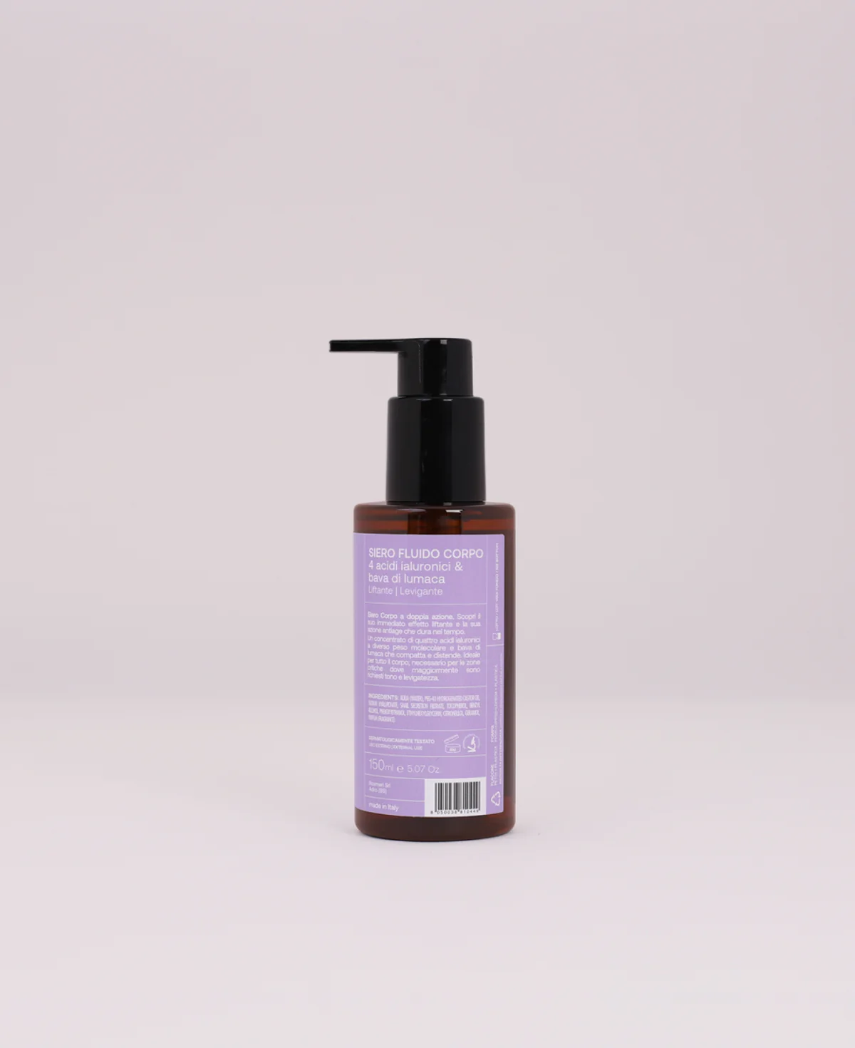 Siero concentrato a base di sodio jaluronato dai diversi pesi molecolari e bava di lumaca. Il prodotto ha un profumo fiorito e fresco. All’applicazione è immediato l’effetto liftante cutaneo e a seguito di assorbimento del prodotto migliorano la levigatezza e la setosità della pelle.